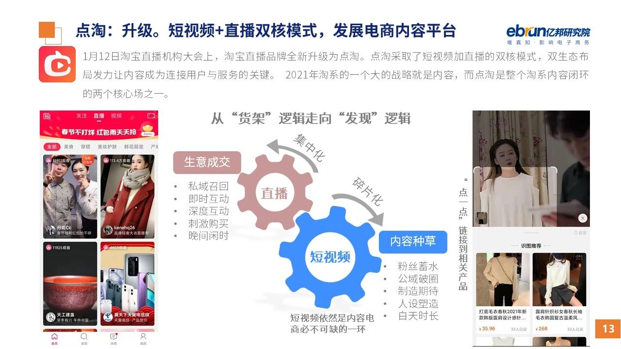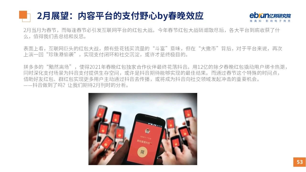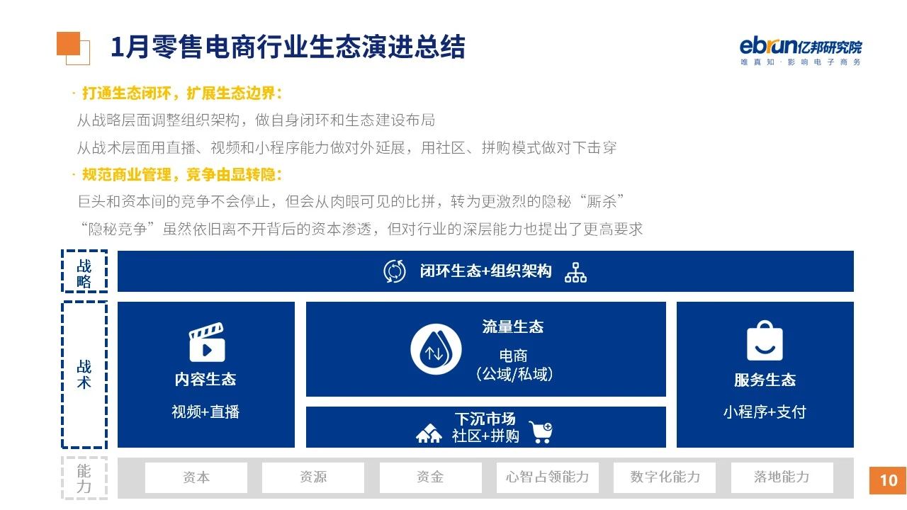縱觀2021年1月,各平臺(tái)豐富自有生態(tài)布局,如淘寶直播(點(diǎn)淘)加入短視頻模式、騰訊重押視頻號(hào)、快手加碼電商和小程序、抖音推出支付等;視頻內(nèi)容成為各平臺(tái)未來重點(diǎn)發(fā)力方向;“九不得”新規(guī)發(fā)布后社區(qū)團(tuán)購仍熱情不減;國家和市場(chǎng)對(duì)互聯(lián)網(wǎng)巨頭和電商相關(guān)消費(fèi)加大監(jiān)管力度……你信和不信,你知道和不知道的,都在這份億邦動(dòng)力研究院正式發(fā)布的